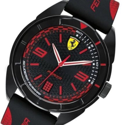 "Forza captures the true racing spirit of Scuderia Ferrari with its race-car inspired details. This 45mm 3-hand watch features a textured dial offered in a range of bold colors, including black, red or blue colored dial. With large Arabic numbers at 3 o’clock and 9 o’clock, the font is found on the nose of the Scuderia Ferrari F1 single seater.3H Black Abs Case 45mm Black Silicone Strap with Red Details.Quartz movement with analog display Durable mineral crystal protects watch fromscratches