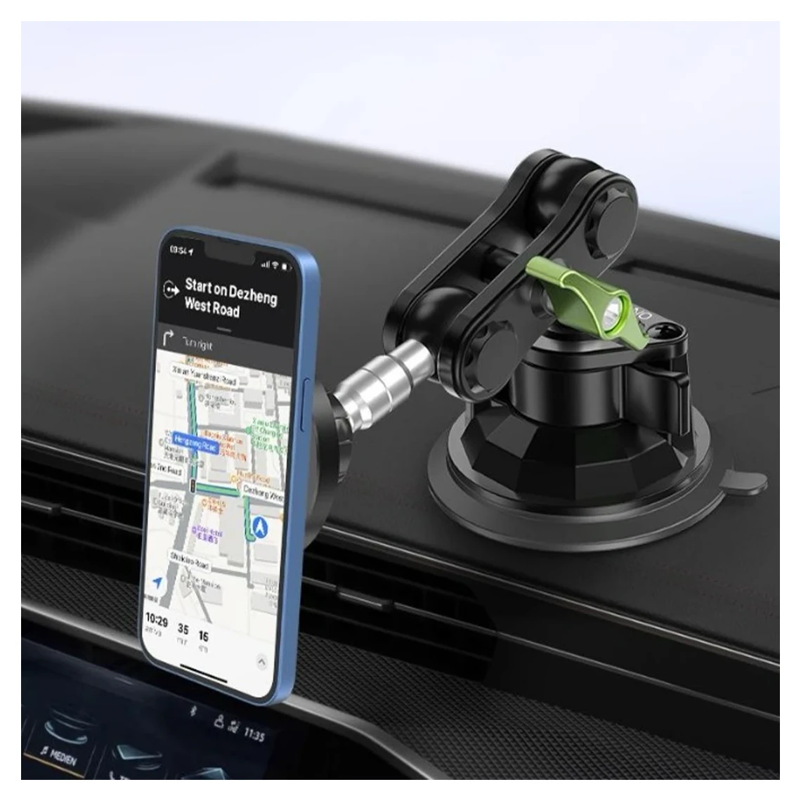 The Cleo-MA Universal Phone Holder RBA M01 features a magnetic suction design for secure mounting without tools. Its adjustable arm and 360° rotation provide optimal viewing angles, making it ideal for dashboards and desks.